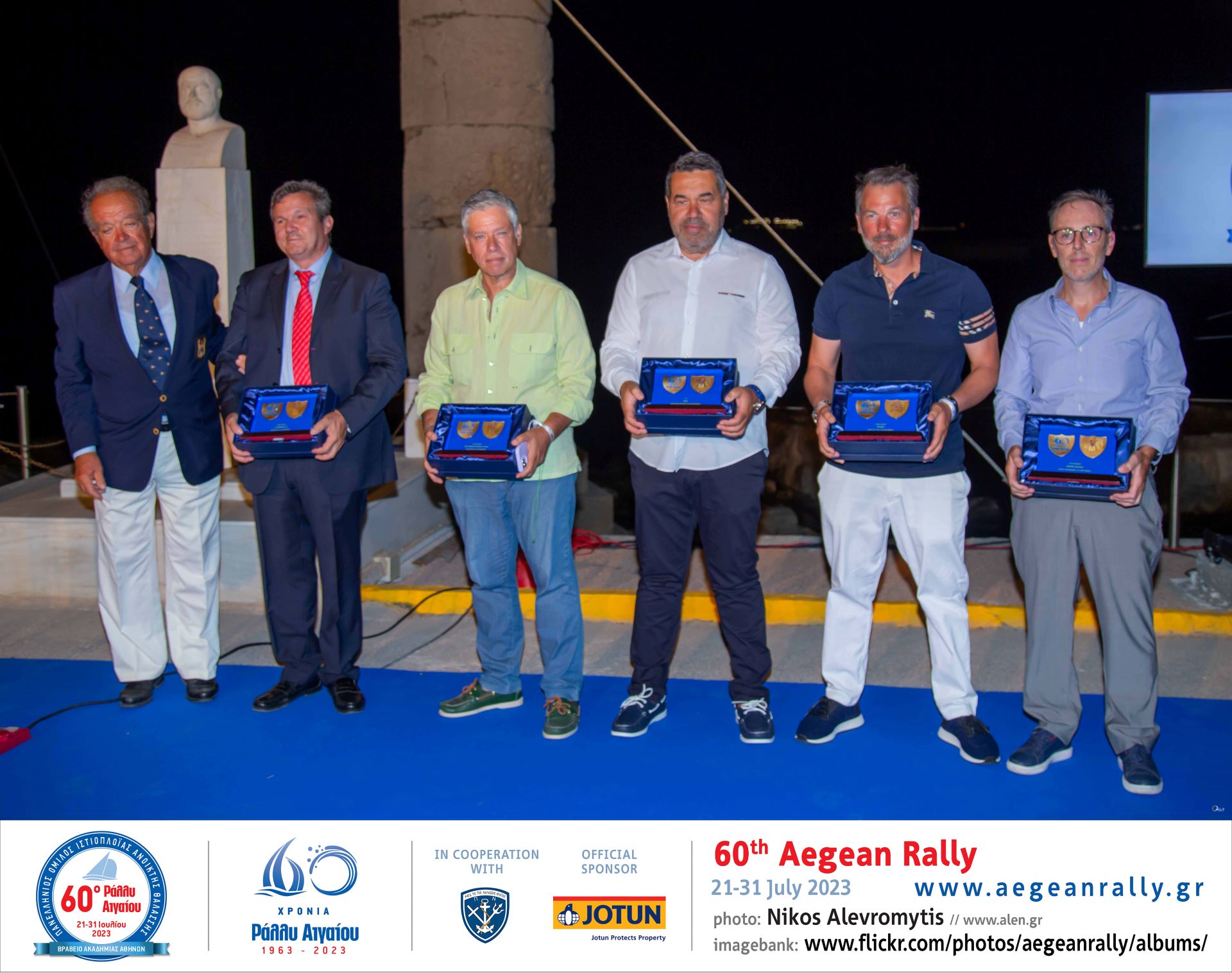- Το πλήρωμα του σκάφους VENTUS που κέρδισε την 1η θέση της κατηγορίας Sport του 60ου Ράλλυ Αιγαίου με τον Αρχηγό ΓΕΝ, Αντιναύαρχο Ιωάννης Δρυμούση Π.Ν., που τους απένειμε το κύπελλο.