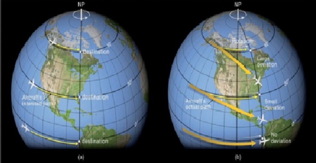 Σχήμα 2: Η δύναμη Κοριόλις είναι μία αδρανειακή δύναμη που οφείλεται στην περιστροφή της γης. Η δύναμη αυτή έχει ως αποτέλεσμα την εκτροπή των κινούμενων αντικειμένων στην ατμόσφαιρα προς τα δεξιά στο Β.Η. και προς τα αριστερά στο Ν.Η. ως προς την κίνηση του σώματος. Στο σύνδεσμο https://www.youtube.com/watch?v=i2mec3vgeaI μπορείτε να παρακολουθήσετε (στα Αγγλικά) ένα επεξηγηματικό βίντεο για τη φύση αυτής της δύναμης. Πηγή σχήματος: Meteorology Today – C. Donald Ahrens (Brooks/Cole Cengage Learning).