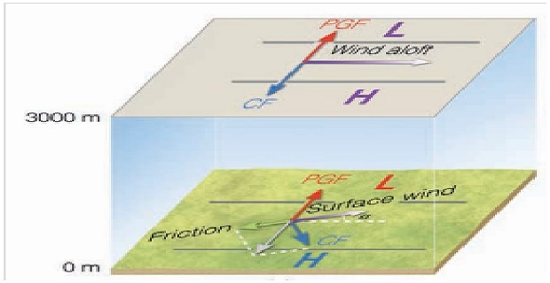 Σχήμα 5: Ο άνεμος στην επιφάνεια έχει διαφορετική διεύθυνση από τον άνεμο στα υψηλότερα στρώματα, ο οποίος είναι απαλλαγμένος από τριβές. Έτσι αν ο άνεμος στην επιφάνεια είναι νοτιοδυτικός στα υψηλότερα στρώματα ο άνεμος θα είναι δυτικός.