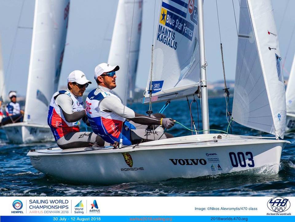 Τα 470 ανδρών ήταν η μοναδική κατηγορία που έτρεξε χθες στο παγκόσμιο πρωτάθλημα της Δανίας. Η μπουνάτσα που επικρατούσε δεν επέτρεψε στα σκάφη των άλλων κατηγοριών να βγάλουν κούρσες.