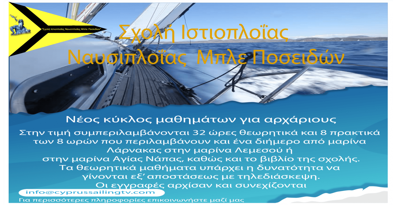Η Σχολή Ιστιοπλοΐας Ναυσιπλοΐας Μπλε Ποσειδών βάζει πλώρη για ένα συναρπαστικό ταξίδι γνώσεων και εμπειριών στον μαγικό κόσμο της Ιστιοπλοΐας. Ανοίγουμε πανιά και σαλπάρουμε με προσοντούχους και έμπειρους εκπαιδευτές / εξεταστές από Κύπρο και Ελλάδα. Ίσως η μοναδική σχολή στην Κύπρο με 64 ώρες πρακτικά μαθήματα. Η σχολή διαθέτει δύο ιστιοπλοϊκά σκάφη διαφορετικού τύπου όπου οι φοιτητές της σχολής θα έχουν την ευκαιρία να εκπαιδεύονται εναλλάξ και στα δύο. Με το πέρας των μαθημάτων οι εκπαιδευόμενοι θα παρακαθήσουν σε θεωρητικές και πρακτικές εξετάσεις για απόκτηση του Διπλώματος Ιστιοπλοΐας /Bareboat Skipper. Δώρο της σχολής μια επιπλέον μέρα μαθήματος εντελώς δωρεάν με το αγωνιστικό σκάφος COMETA Open 65