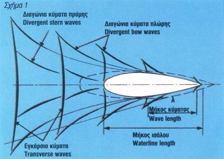 μας, ένα ιστιοφορο βαρέος εκτοπίσματος. Όπως είδαμε, το κύμα δημιουργείται από τη γάστρα και την αντίσταση, που προβάλλει στο νερό. Όταν το σκάφος μας φτάσει το μέγιστο της ταχύτητάς του, είδαμε ακόμα ότι δημιουργείται ένα και μοναδικό κύμα. ?ρα μπορούμε να πούμε ότι και το σκάφος θα φτάσει μια ταχύτητα ίση με εκείνη του κύματος, που το ίδιο δημιουργεί. Είναι μια ταχύτητα, που εξΆ ορισμού δεν μπορεί να υπερβεί. ?ρα μπορούμε να πούμε ότι η ταχύτητα αυτή είναι και η μέγιστη θεωρητική ταχύτητα του σκάφους μας.